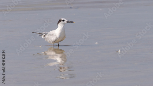 A single sandwich tern standing in shallow water on the beach in Anastasia State Park