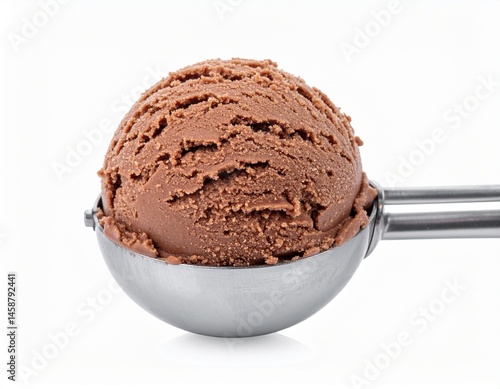 A single scoop of rich, chocolate ice cream sits nestled in a shiny, metal scoop, ready for enjoyment. It's a delightful, refreshing treat