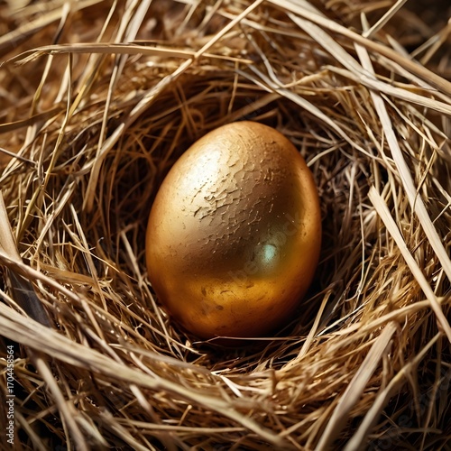 A single shiny golden egg placed in a nest of straw, dramatic studio lighting, luxury and success symbolism, high-resolution, elegant stock photography concept,Generative Ai