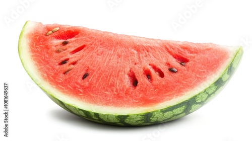 A single slice of fresh watermelon with black seeds isolated on white background.