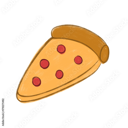 A single slice of pepperoni pizza, depicted in a simple, cartoon-like illustration style, isolated on a white background.