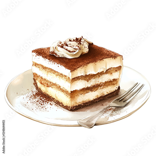"A Single Slice of Tiramisu on a White Plate with a Fork Beside It, Garnished with Cocoa Powder and Whipped Cream."