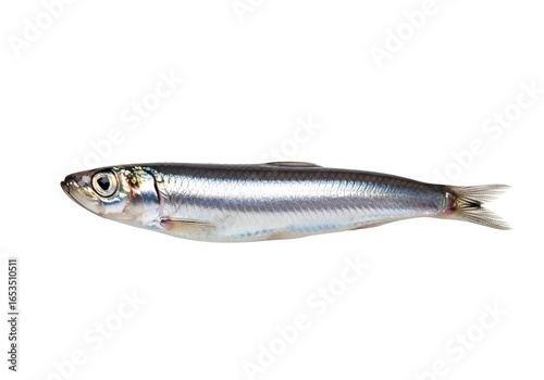 A single small fish, silver-gray in color, displayed against a pure black background.
