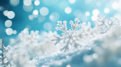 A single snowflake sits atop a layer of snow with a blurry, sparkling blue background.