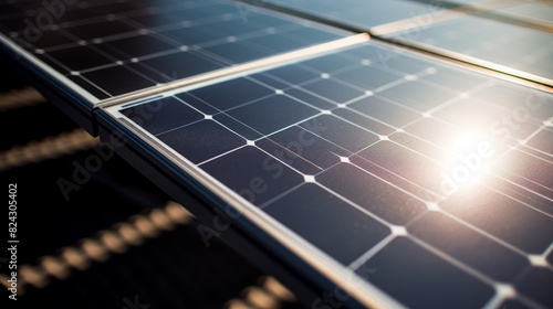 a single solar panel, showcasing its intricate details and the way it captures the sun's light. The panel should be slightly tilted, casting long shadows and creating a sense of depth.
