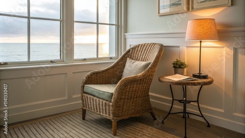 A single statement chair made of woven material occupies a cozy corner offering a perfect spot for reading or contemplation.