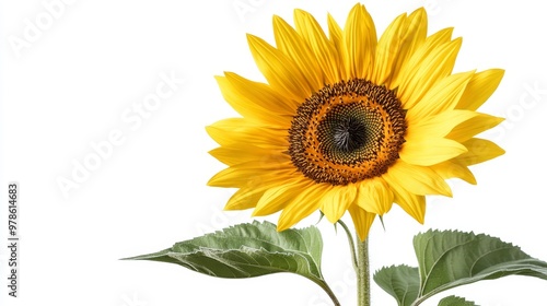 A single sunflower in full bloom, with vivid yellow petals and a deep brown center, isolated on a pure white background, perfect for summer-inspired visuals.