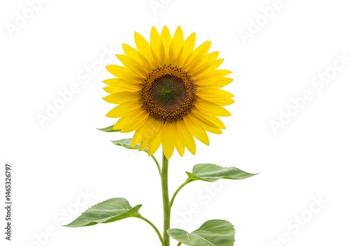 A single sunflower with green leaves isolated on a white background in a close up studio shot