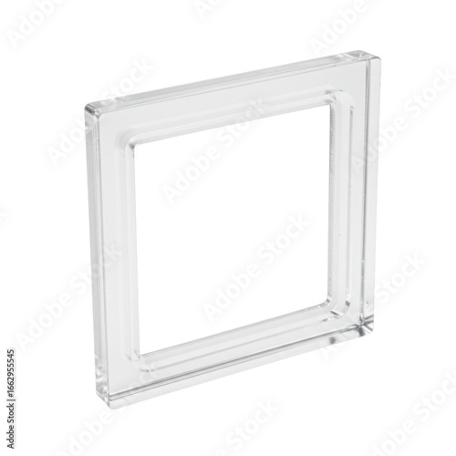 A single, translucent, colorless plastic suncatcher frame with clear contours, smooth, reflective, isolated on a stark white background, concept of clean product display