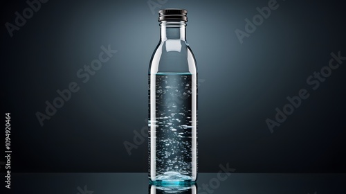 A single, transparent plastic bottle of cold, clear mineral water, isolated on a white background