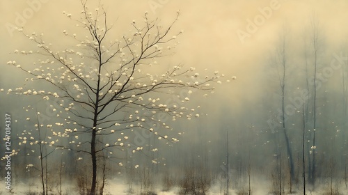 A Single Tree Blossoms In A Misty Forest
