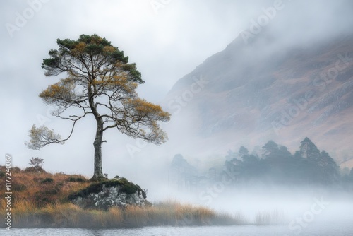 A single tree on a rocky shore with fog in the background