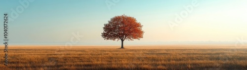 A single tree standing alone in a field, with a clear sky as the backdrop