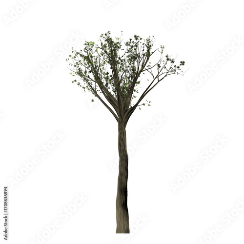 A single tree with a tall trunk and green leaves isolated against a stark black background in a studio shot