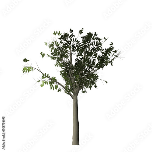 A single tree with green leaves and a light brown trunk isolated on a black background in the dark night