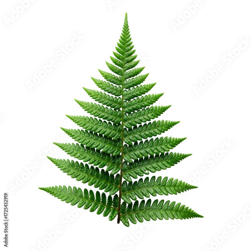 A single, vibrant emerald green tropical fern frond, glossy, water droplets, fractal patterns, extreme close-up, transparent studio background, concept of natural beauty and symmetry