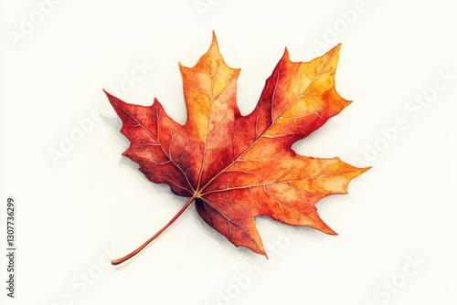 A single, vibrant red and orange maple leaf, delicately rendered against a white background.
