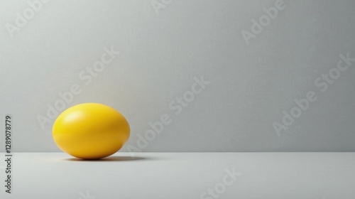 A single vibrant yellow sphere rests gently on a minimalist grey surface against a muted backdrop