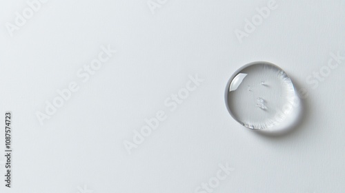 A single water droplet rests on a smooth white surface, showcasing clarity and simplicity.