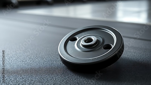 A single weight plate resting on a gym floor, showcasing metallic reflections and minimalistic design.