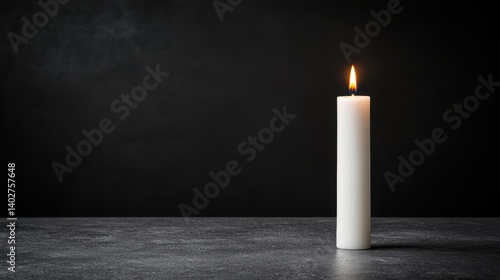 A single white candle with a flickering flame stands on a dark gray surface against a black background.