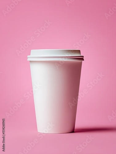 A single white disposable coffee cup with a lid sits on a pink background, casting a slight shadow