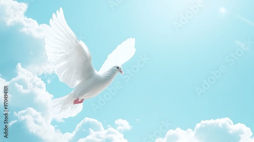 A Single White Dove Soaring Through a Blue Sky With Clouds