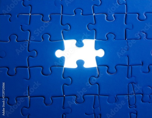 A single white jigsaw puzzle piece missing from a blue puzzle