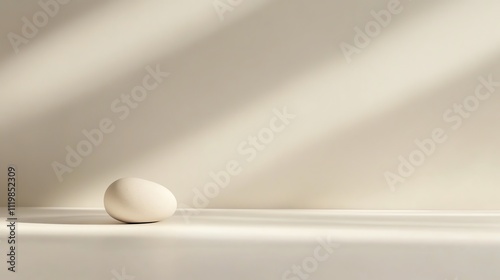 A single white orb sitting on a white surface with light shining through the window behind it.