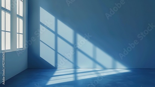 A single window is positioned on the wall of a blue room. Sunlight streams in through the window, casting long, rectangular shadows on the walls and floor. The room is empty, with only the light and s