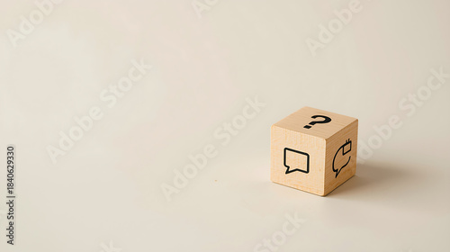 A single wooden cube is placed on a smooth light-beige surface against a soft neutral background. It is positioned on the right side of the frame.