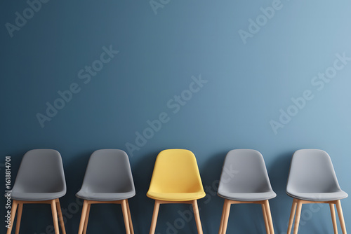 A Single Yellow Chair Among Gray Chairs Against a Teal Wall. AI Generated