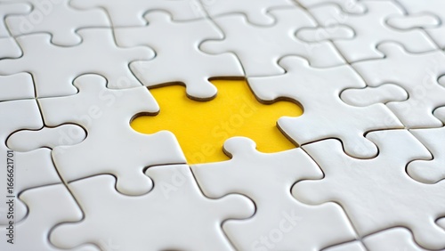 A single yellow puzzle piece missing from a white jigsaw puzzle