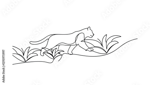 A singleline illustration depicts a cougar gracefully moving through tall grass. The minimalist style emphasizes the animals fluid motion and natural environment.