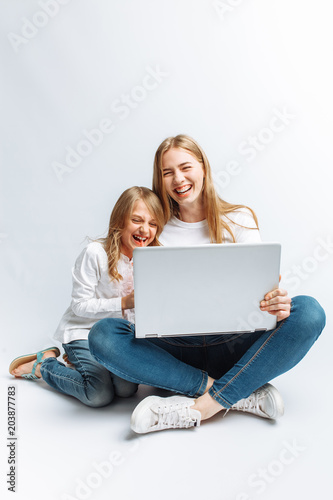 A sister or a young mother with her daughter watching a movie on my laptop, fun, laughing, Studio, isolated