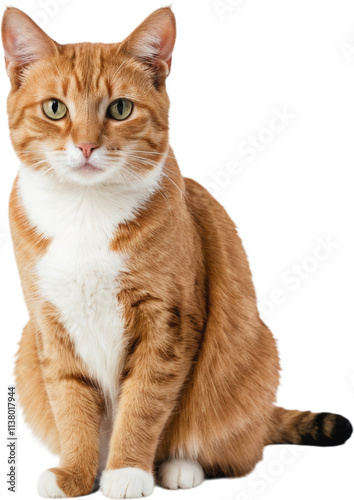 A Sitting Orange Tabby Cat with White Chest and Paws isolated on Transparent and White Background