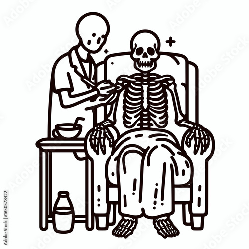 A Skeleton as caregiver. Retro Vintage Line Art Clipart Silhouette Vector Illustration. Bony figure doing patient tending work physical assistance mortal remain aid.