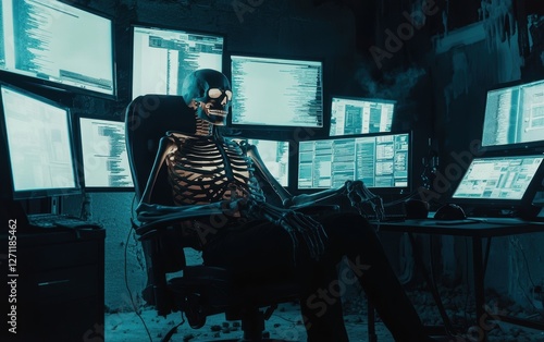 A skeleton hacker sitting in a dark room surrounded by glowing screens