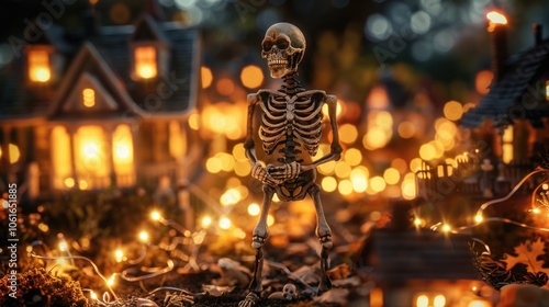 A skeleton standing in a peaceful garden setting