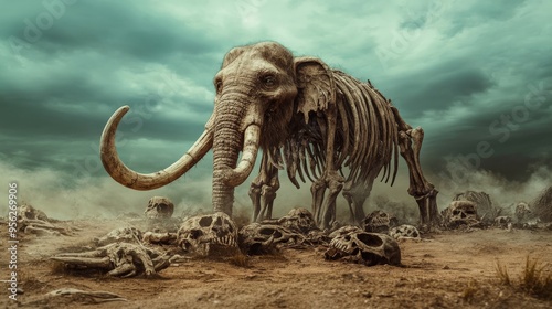 A skeletonized elephant is standing in a desert with many skulls around it