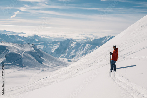 A skier goes skiing from the top of the mountain on a beautiful sunny day. Caucasus mountains in winter, Georgia, Gudauri region, Mt. Kudebi.
