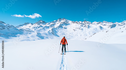 A skier traverses a pristine snowy landscape, surrounded by majestic mountains under a clear blue sky. Winter adventure and exploration.