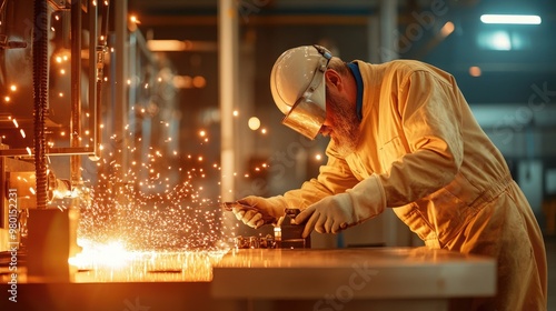 A skilled worker in protective gear engages in metalworking, creating sparks in a dynamic industrial environment.
