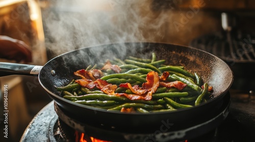 A skillet with green beans and bacon cooking on a stove, creating steam.