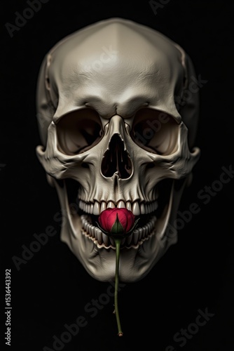 A skull holding a rose between its teeth on a pitch-black background. The image combines themes of mortality and delicate beauty