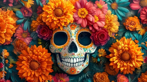 A skull surrounded by a vibrant bouquet of colorful flowers in bloom