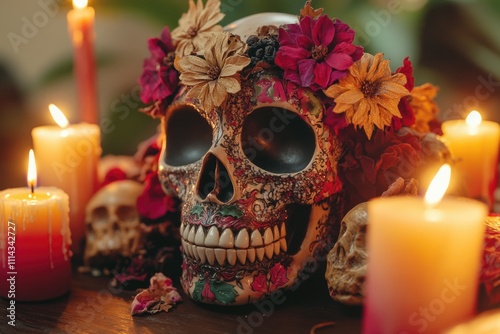 A skull surrounded by candles and flowers, suitable for Halloween or dark-themed designs