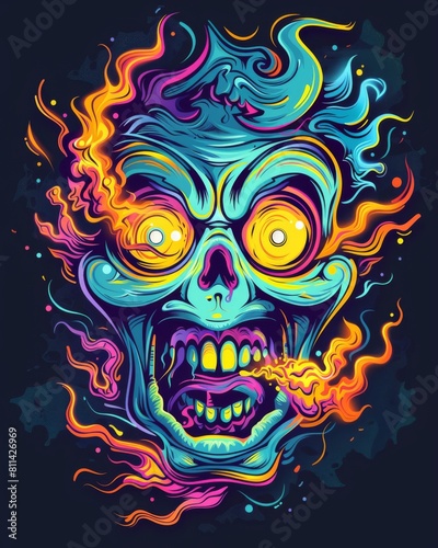 A skull with glowing eyes holds a cigarette in its mouth, set against a vibrant black background