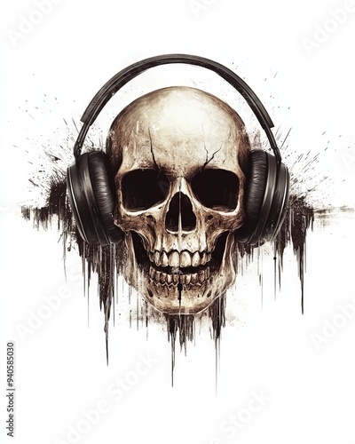 A skull with headphones on, DJ-style, with sound waves visualized around it, set on a white background with space for copy