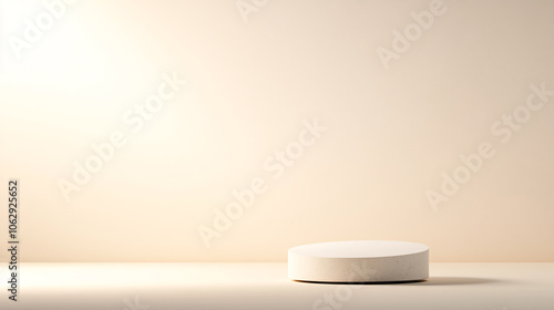 A sleek 3D-rendered product podium set against a soft, gradient background. The podium is cylindrical and features a polished finish, with even lighting casting subtle reflections. Gentle shadows